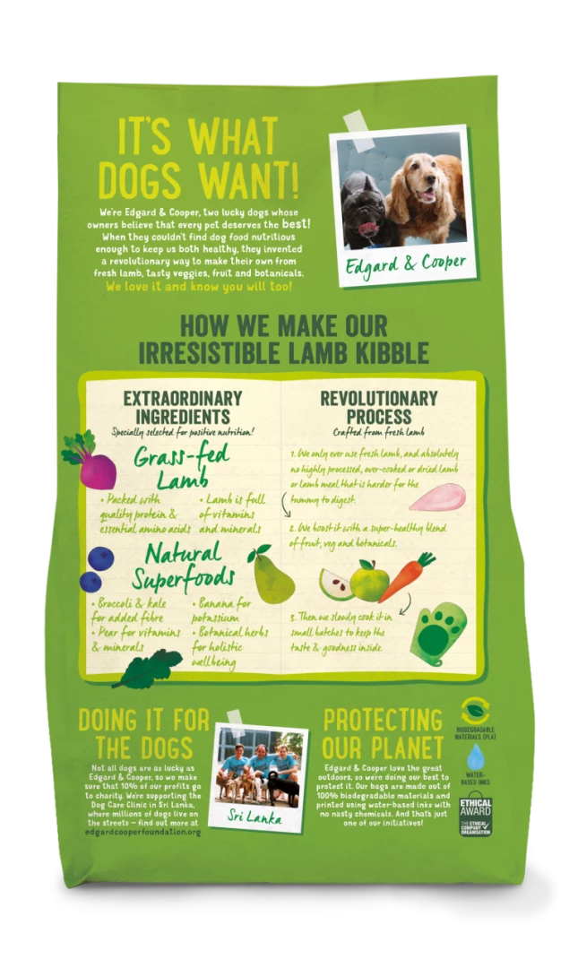 In Edgard & Cooper hondenvoer Adult graslam wordt enkel vers graslam gebruikt en absoluut geen bewerkte, overgare of gedroogde lam of lamsmeel dat moeilijker is voor de buikjes om te verteren. Daarnaast wordt er een supergezonde mix van fruit, groenten en kruiden toegevoegd.