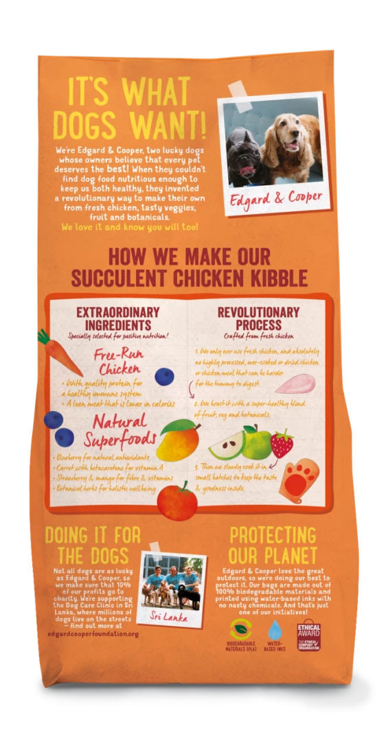 In Edgard & Cooper hondenvoer Adult scharrelkip wordt enkel verse scharrelkip gebruikt en absoluut geen bewerkte, overgare of gedroogde kip of kippenmeel dat moeilijker is voor de buikjes om te verteren. Daarnaast wordt er een supergezonde mix van fruit, groenten en kruiden toegevoegd.