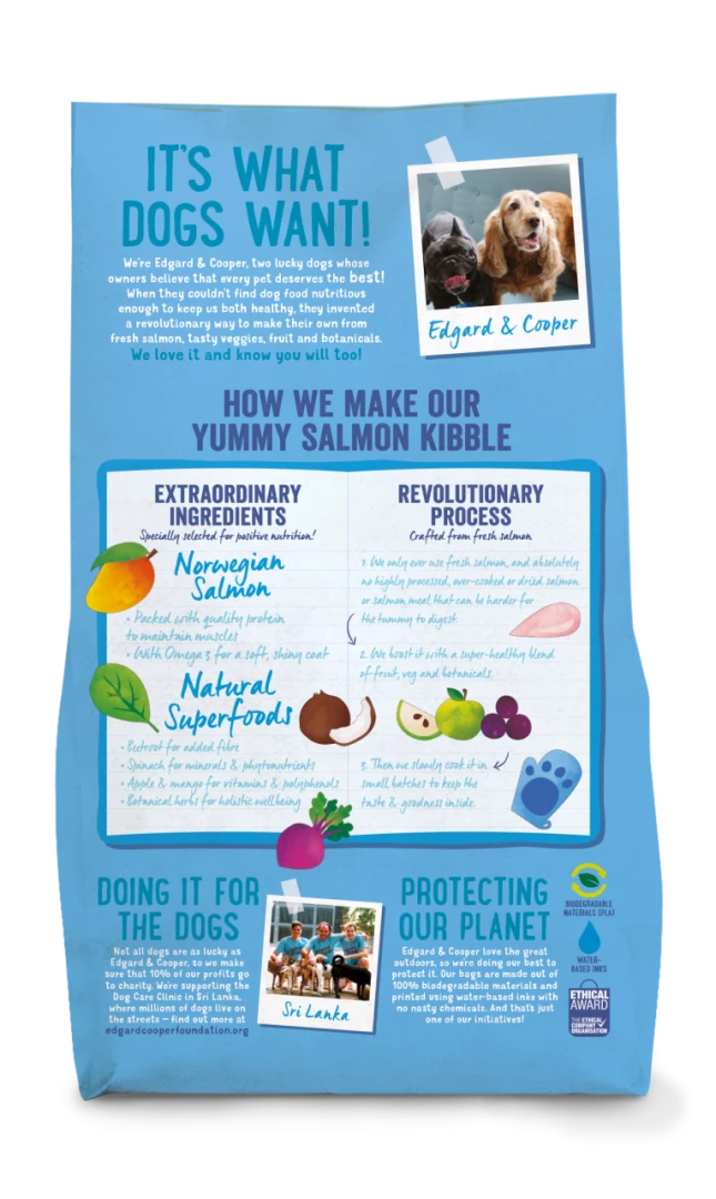 In Edgard & Cooper hondenvoer Adult Noorse zalm wordt enkel verse Noorse zalm gebruikt en absoluut geen bewerkte, overgare of gedroogde zalm of zalmmeel dat moeilijker is voor de buikjes om te verteren. Daarnaast wordt er een supergezonde mix van fruit, groenten en kruiden toegevoegd.