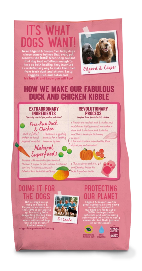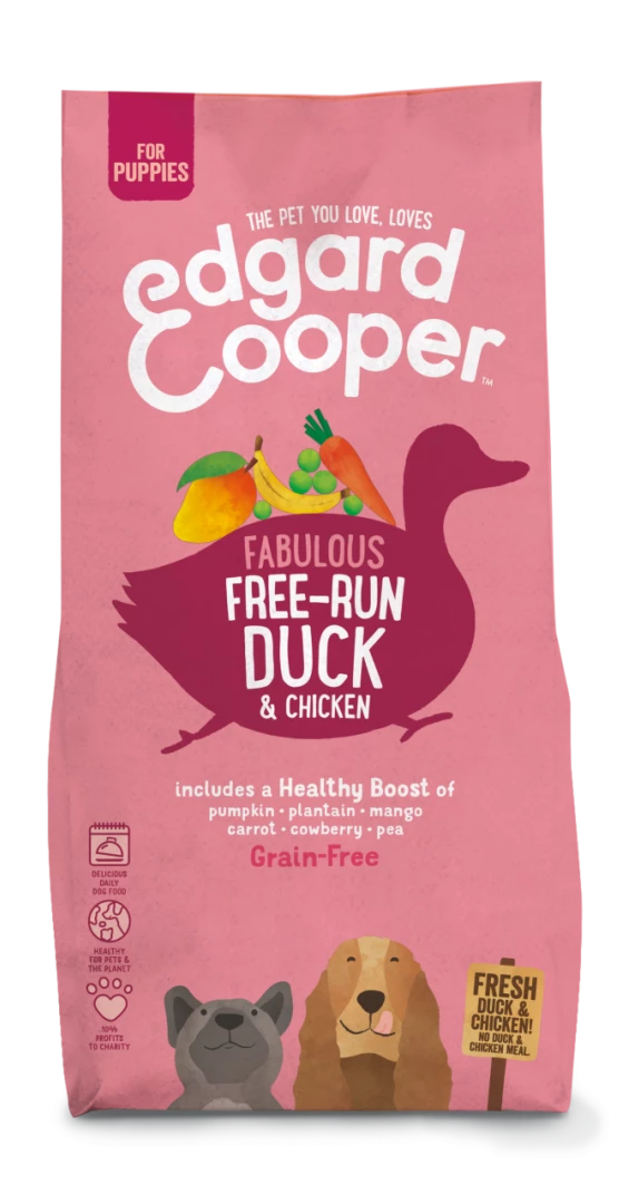 In Edgard & Cooper hondenvoer Puppy scharreleend en scharrelkip wordt enkel verse scharreleend en verse scharrelkip gebruikt en absoluut geen bewerkte, overgare of gedroogde eend en kip of meel van eend of kip dat moeilijker is voor de buikjes om te verteren. Daarnaast wordt er een supergezonde mix van fruit, groenten en kruiden toegevoegd.