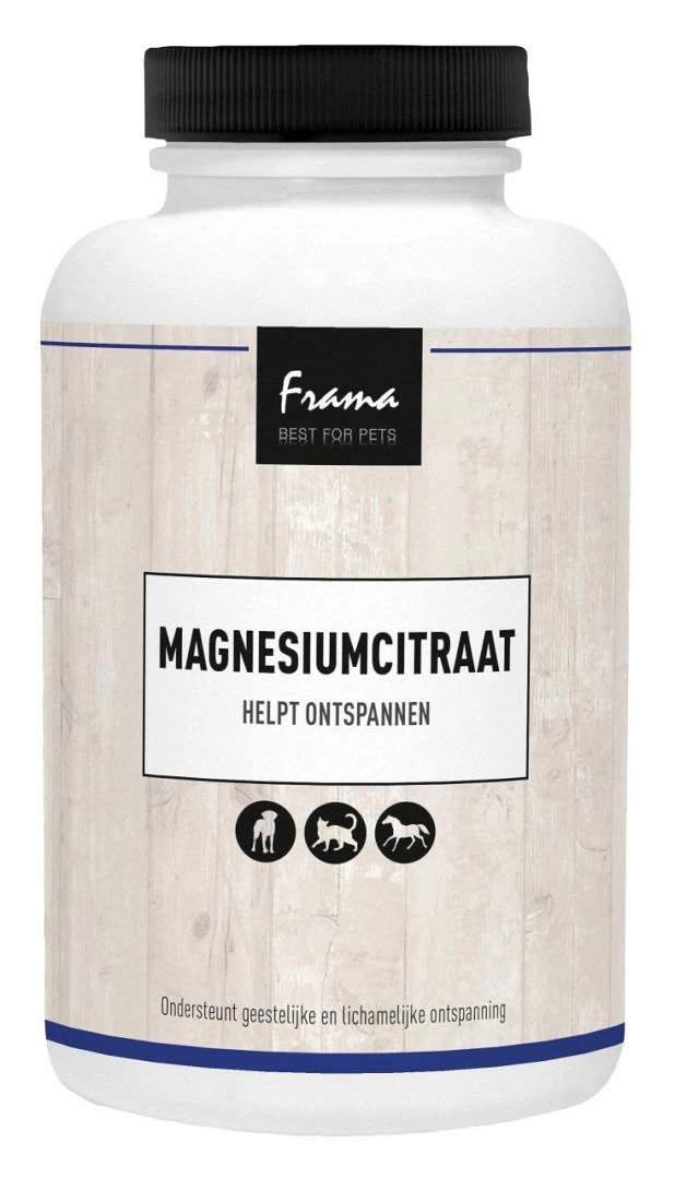 Frama Best For Pets Magnesium Citraat bestaat uit 100% magnesiumcitraat. Magnesium is een belangrijk mineraal ter ondersteuning van vele vitale functies in het lichaam. Magnesium wordt ook wel “anti-stressmineraal” genoemd. Het ondersteunt bij ontspanning, zowel geestelijk als lichamelijk. Het zorgt voor totale ontspanning van de spieren en helpt bij vastzittende spieren en stramheid. Het ondersteunt ook het zenuwgestel. Magnesium is tevens essentieel voor de instandhouding van normale botten en tanden.