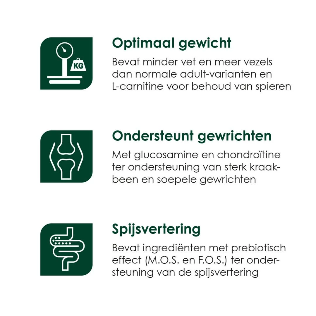 | Optimaal gewicht Bevat minder vet en meer vezels dan normale adult-varianten en L-carnitine voor behoud van spieren.  |